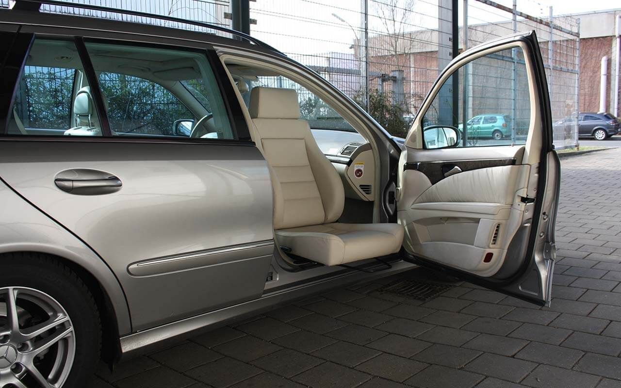 Der (manuell) schwenkbare und herausziehbare Autositz erleichtert Ihnen als Beifahrer das Ein- und Aussteigen erheblich. Gleichwohl stellt dieser Sitz eine Hilfe für die Betreuungsperson dar. Das Schwenken und die Vor-/Zurückbewegung können optional elektrisch erfolgen, zudem sind diverse Zusatzausstattungen wie Sitzheizung, Armlehnen etc. möglich. In der Regel finden Sitze der Hersteller Greiner, RECARO oder König Anwendung, auf Wunsch können jedoch (vorbehaltlich technischer Machbarkeit) auch die Originalsitze verwendet werden.
