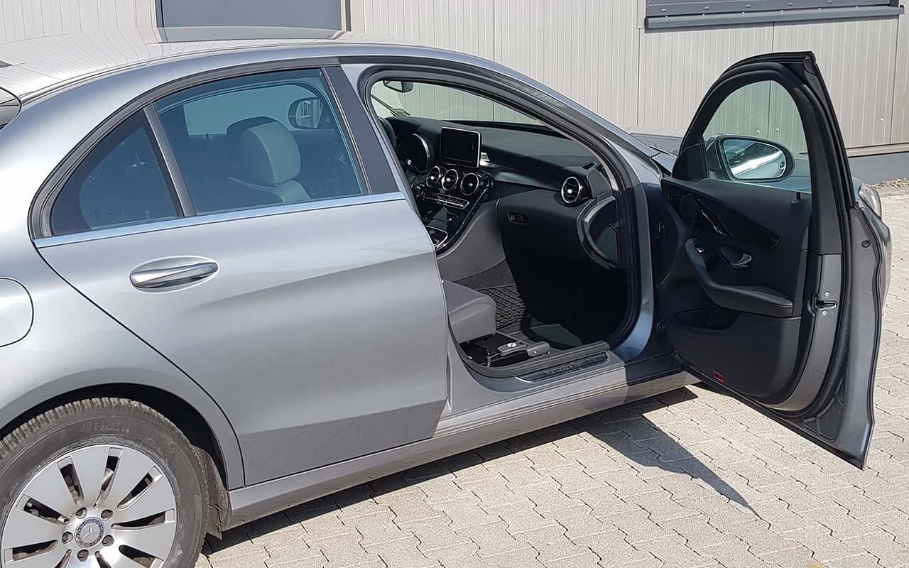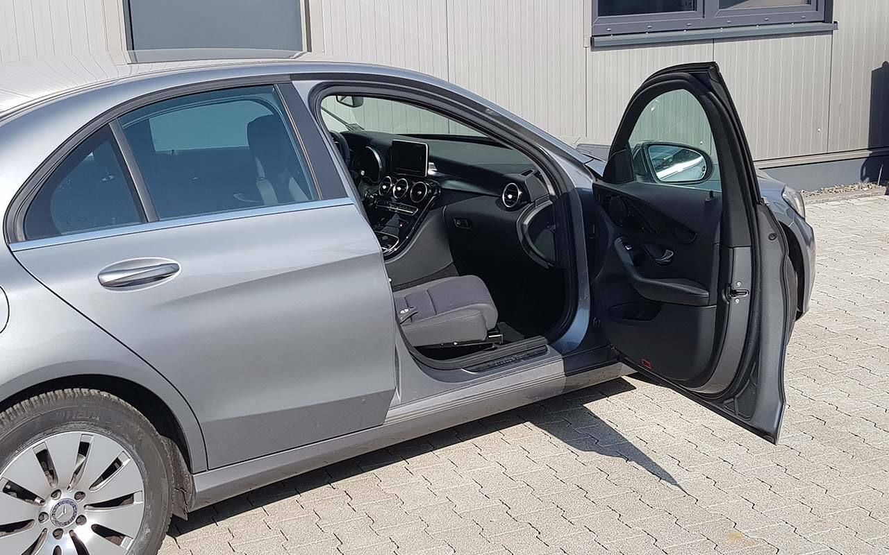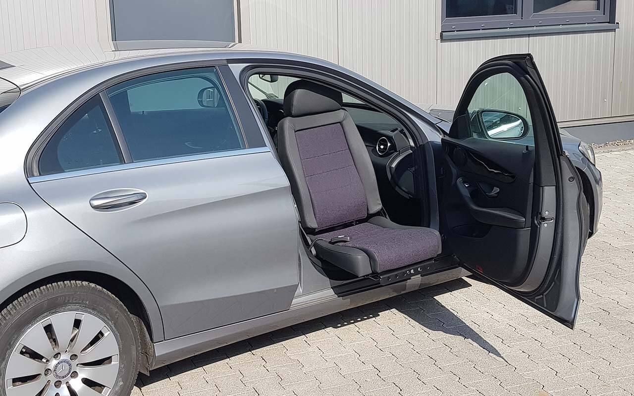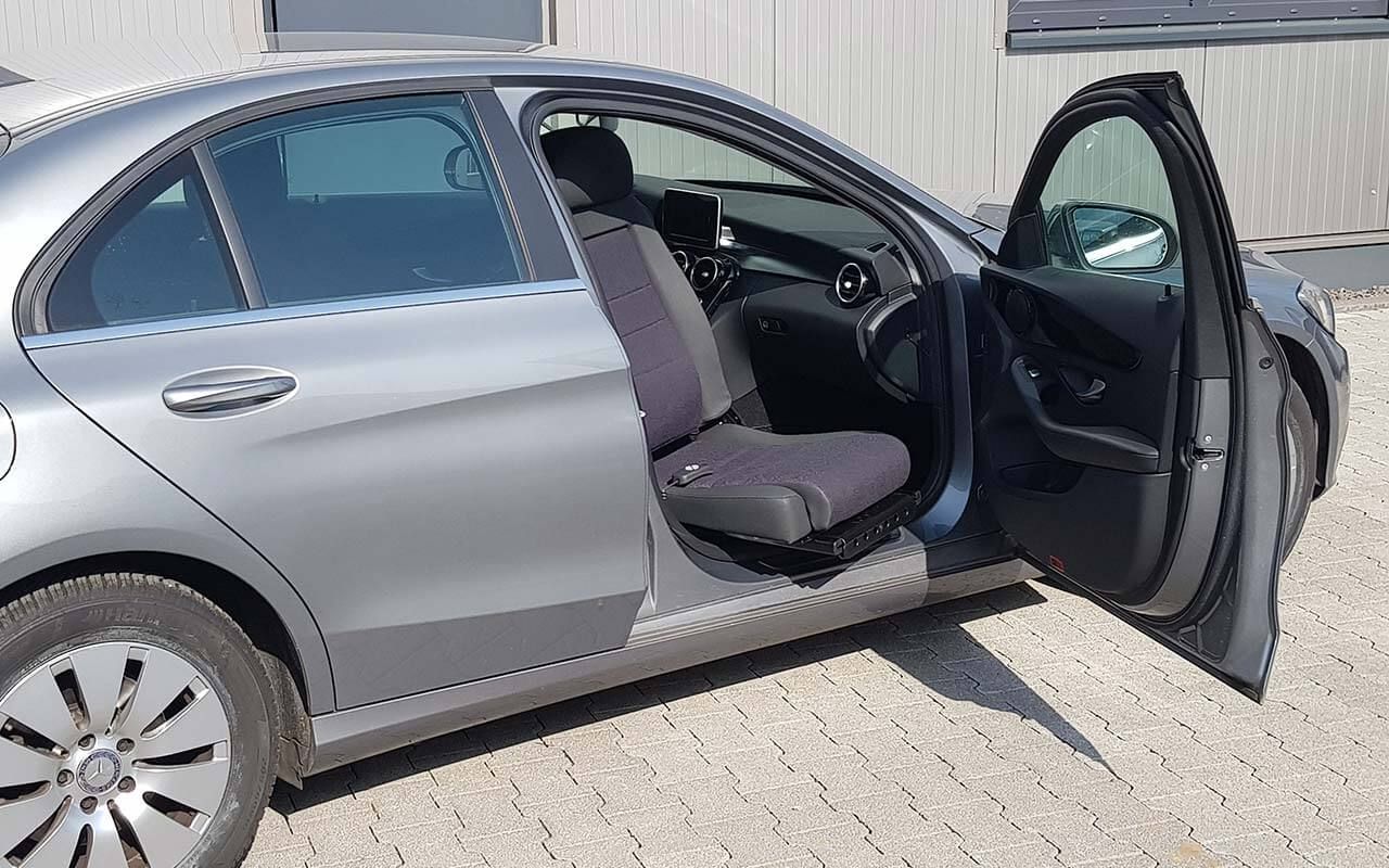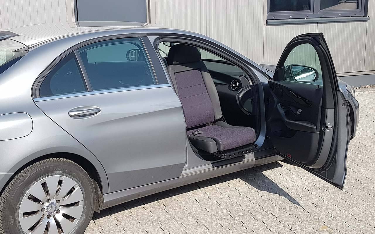 Der elektrische Schwenksitz Turny Low kann sowohl auf der Fahrer- als auch auf der Beifahrerseite montiert werden. Per Kopfdruck schwenkt er um die B-Säule: der fahrzeugspezifisch programmierte Ablauf besteht abwechselnd aus Bewegung nach vorne/hinten und Schwenkbewegung, so verbleibt beim Schwenken möglichst viel Platz für die Füße.